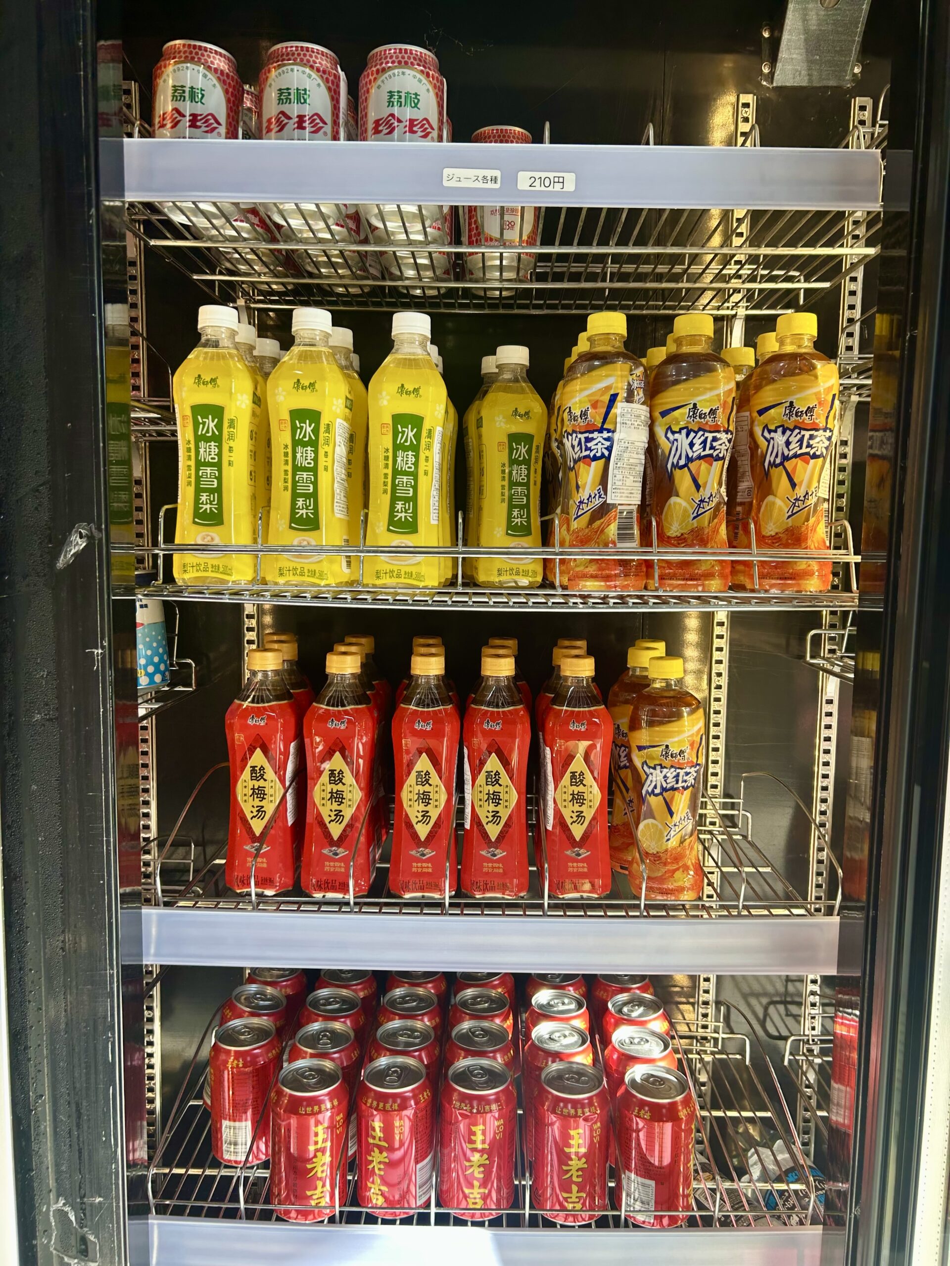 店内の冷蔵庫には、ライチソーダやレモンティー、謎の甘いお茶などがあり、
